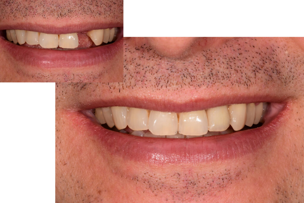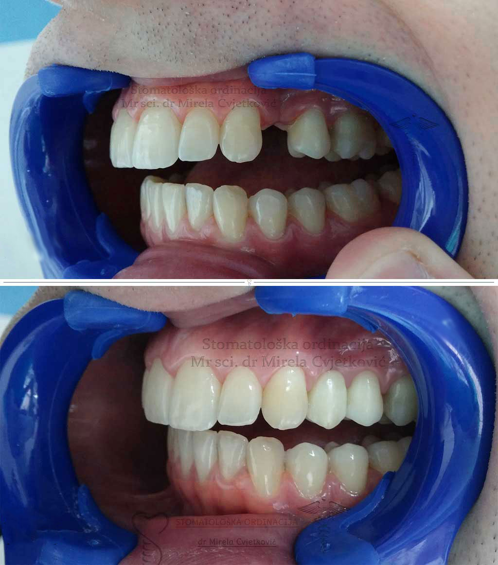 We are faced with several problems here – lack of bone and soft tissue and high aesthetic demands. This is why situations like this demand a lot of doctor`s knowledge and experience, a lot of patient`s effort, often multiple surgical procedures due to maintaing both bone and soft tissue and at the end, excellent sense of aesthetics, to make your crowns identical to natural teeth.