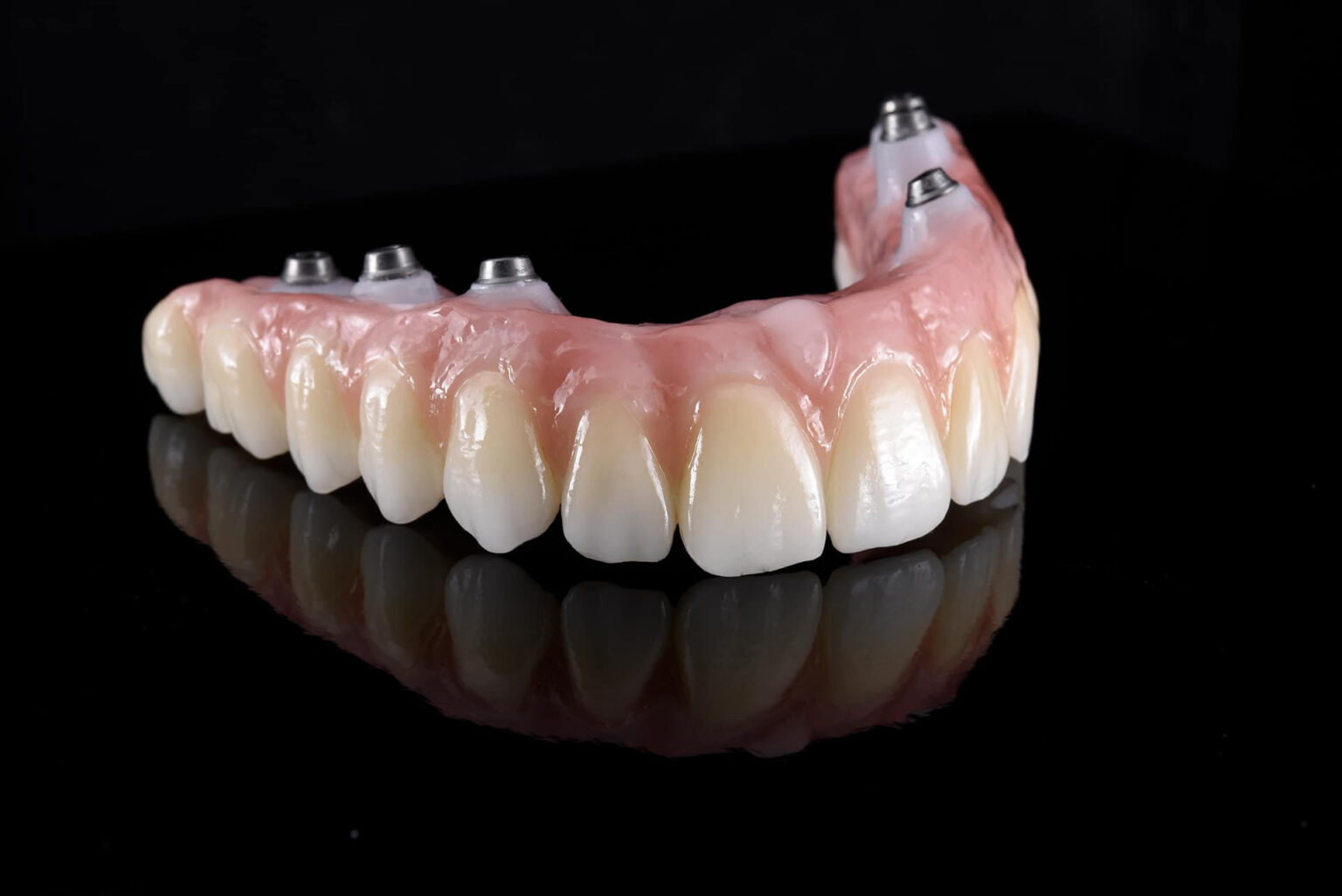 This concept involves a full set of teeth (usually 12 teeth) on only 4 implants, of which the two implants in the back are tilted so that they can receive an increased load.