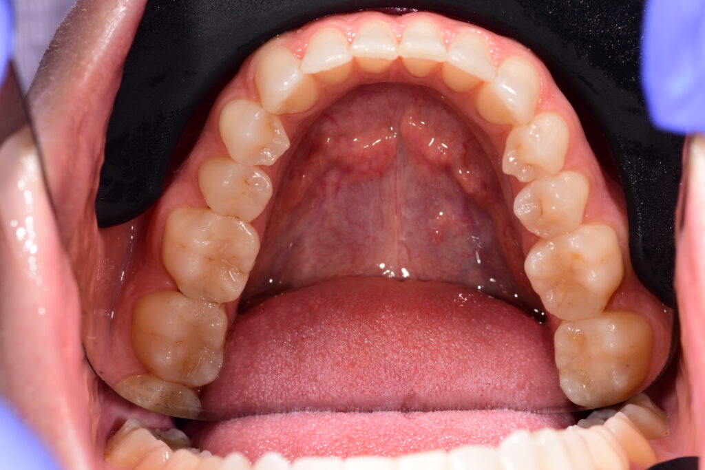 In patients in whom the upper front teeth are too tilted forward, dry mouth occurs because they cannot connect the upper and lower lip due to the position of the teeth.